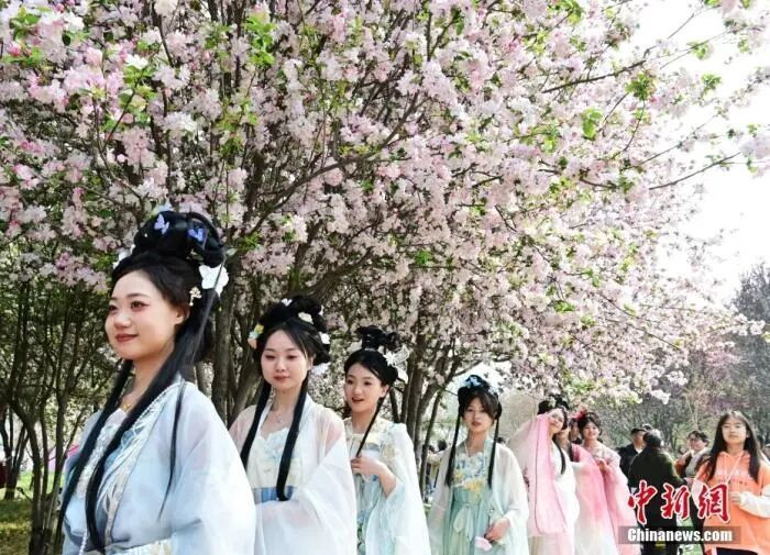 费力图:河北省石家庄市栾城区一公园,身着古装衣饰的旅客踏青游玩,享受好意思好春光。中新社记者翟羽佳摄