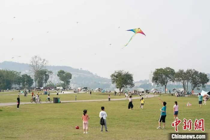 费力图:适值明朗节假期,广西南宁不少大家出门踏青游玩,享受沐日。图为儿童在南宁市龟山滨江公园放风筝。陈冠言摄