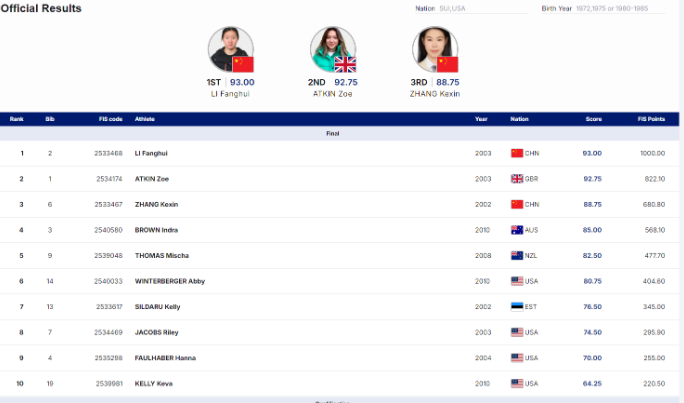 北京时间1月11日凌晨,国际雪联自由式滑雪世界杯阿斯彭站女子U型场地决赛,中国选手李方慧以93分的成绩力压英国选手获得冠军,另外一位中国选手张可欣得到88.75分,获得季军。