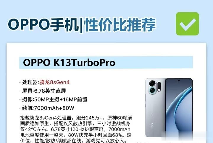 关于年青用户和留神性价比的游戏玩家,OPPO K13 Turbo Pro无疑是一款极具诱导力的家具。该机搭载了骁龙8s Gen 4处理器,跑分跨越245万,互助疾风散热引擎,卤莽保证万古期游戏时的帧率相识。6.78英寸的120Hz护眼直屏为游戏操作提供了极佳的跟手性。最引东说念主介意标是其7000mAh的超大容量电板,重度使用也能坚握一整天,80W快充回血速率也很快。在保握高性能和长续航的同期,K13 Turbo Pro的价钱也极端亲民,是预算有限但对性能有条件的用户的超值之选。