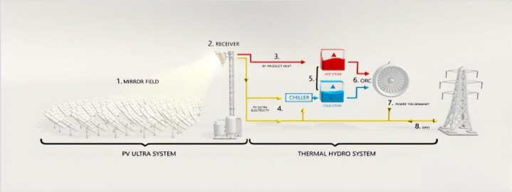 太阳能水电站由“PV Ultra”聚光光伏和“Thermal Hydro”水储热两大系统构成,重构了传统光伏“发电-储能”分散的花式,达成了光电、光热的同步拿获与愚弄。
