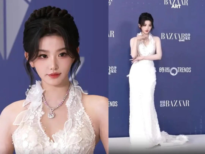 唱跳爱豆出身、如今转型当演员的孔雪儿,穿了一条白色蕾丝挂脖长裙,与之搭配是她万年不变的高颅顶发型。无论是盘发还是披发,她每一次出席活动都必须以高颅顶示人,堪称“高颅顶爱好者”了。