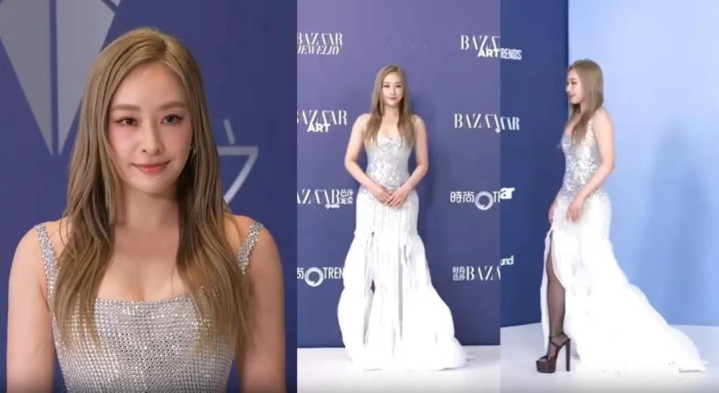 来自TVB的陈滢,穿了一条银白色拼接吊带长裙,但她的妆发和服饰搭配实在让人看不懂,金发、银色亮片长裙和黑色丝袜组合在一起,跟时尚有半点关系吗?