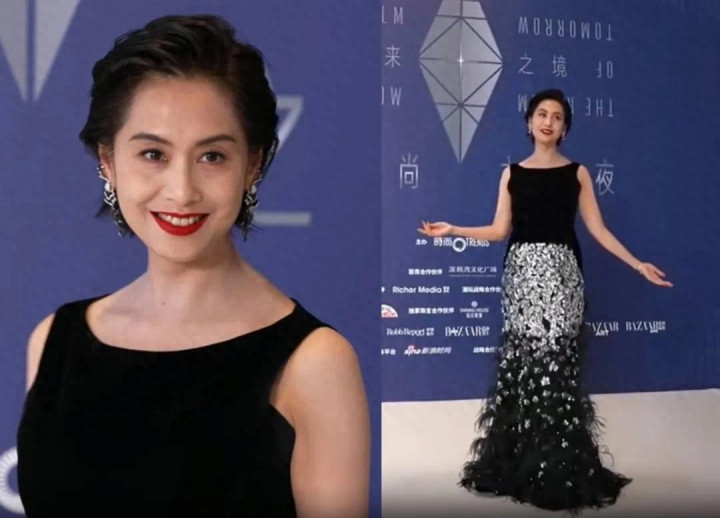 朱茵穿了一条缀有银色亮片的黑色羽毛长裙,搭配一头短发,精气神十足。年轻时的她灵动可爱,如今年过半百美丽优雅,可见岁月并没有影响她的美。