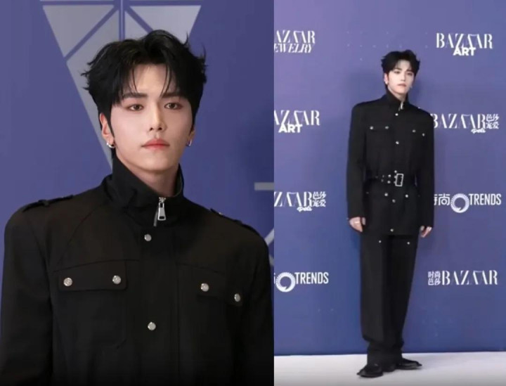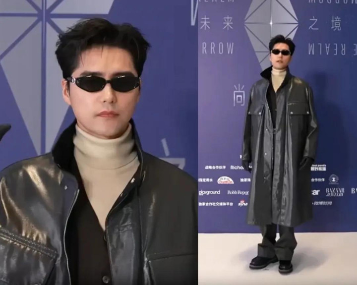 阿云嘎的造型走酷炫风,墨镜和黑色长款皮衣搭起来既有一点未来感,又酷劲十足。也幸好他够高(官方身高184cm),不然矮一点的男明星穿这种外套,小腿分分钟会“消失”。