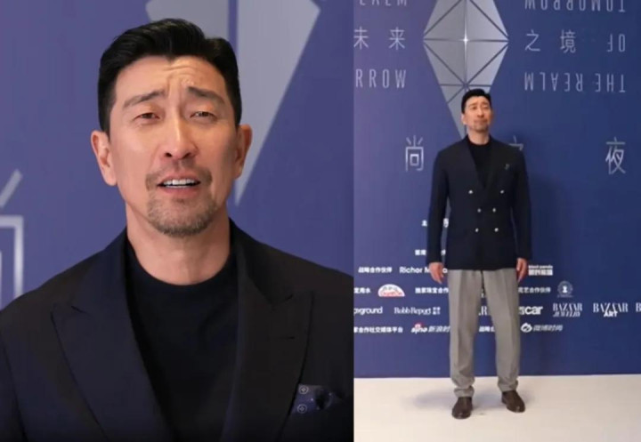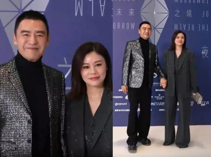 王千源穿的是黑色西服和灰色西裤,服装搭配平平无奇,但因为他人到中年依然保持着高大挺拔的身材,所以看起来比实际年龄(53岁)显年轻,状态很好。
