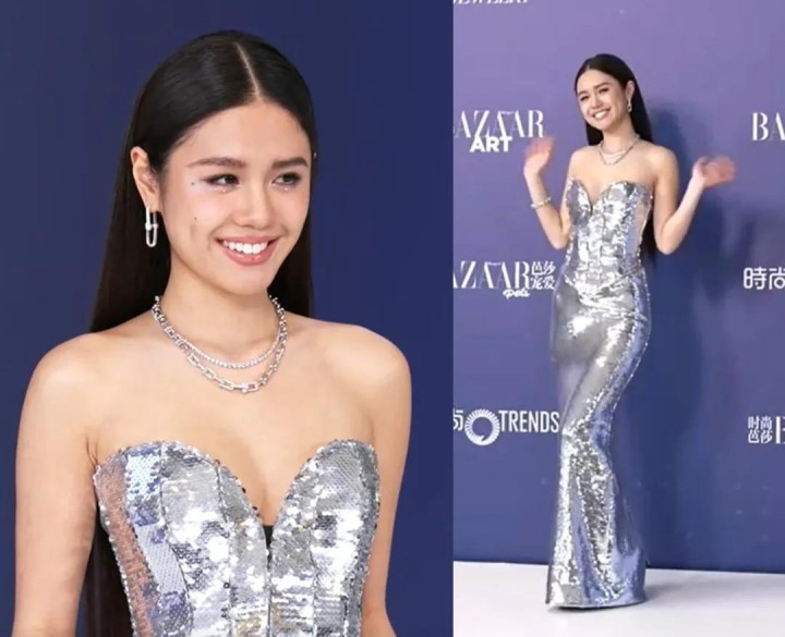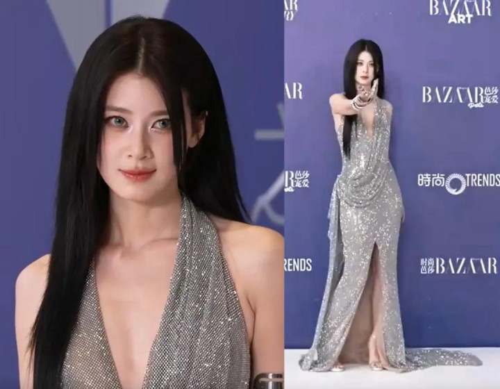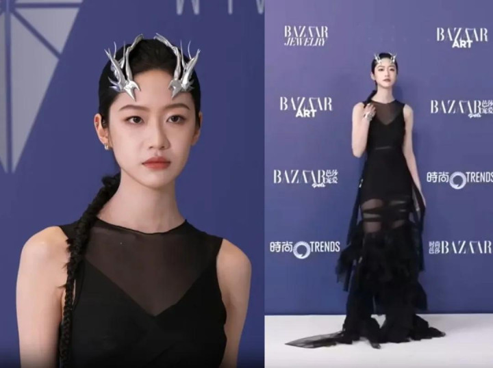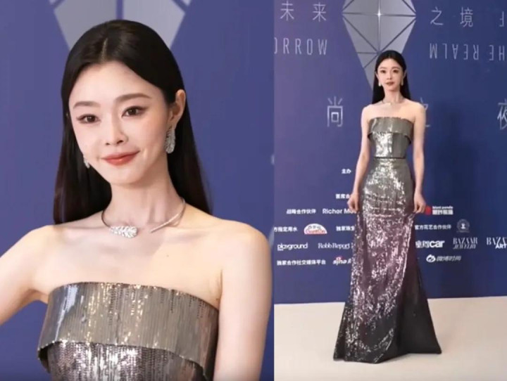 通过旅行综艺一炮而红的赵昭仪,以往呈现出来的形象是随和软萌,没想到她这次尝试了冷艳的风格。她穿了一条银色亮片挂脖长裙,黑长直发型搭配未来感的眼妆,颇有人形机器人的感觉,很符合红毯主题。不过在这妆容下,第一眼看会有点认不出,某些角度还以为是乔欣。