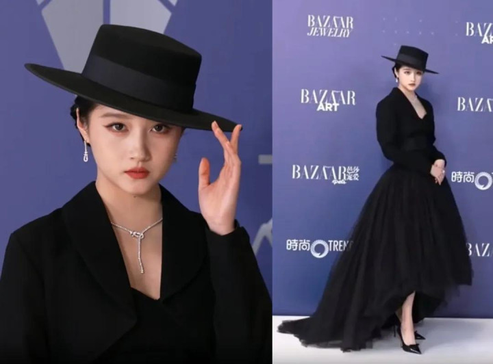 关晓彤难得穿对了衣服,这条黑色裙子虽然说不上很好看,但搭配黑色礼帽很有民国剧特工乔装出席舞会的既视感。单看半身照的话,也很有杂志大片的感觉。整体来看,这身略显复古的造型挺适合她的。