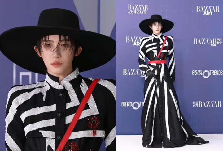 刘宇也是热爱华丽礼服的男爱豆,这次他选了一条黑白长裙,黑色礼帽微微压着长到遮住眼睛的空气刘海,造型很华丽但不太懂造型师想表达什么。