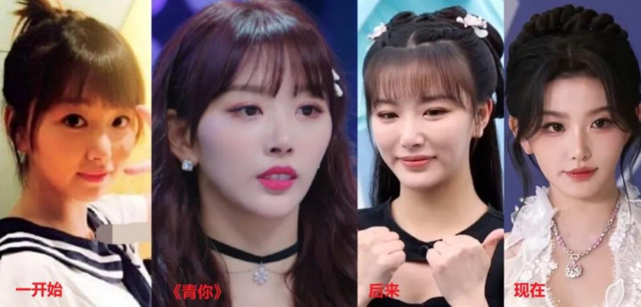 孔雪儿的模样跟出道前以及参加《青春有你2》时变化挺明显的,曾几何时她有些角度会撞脸杨幂,如今完全不像了。虽然她在微调之路上一度走错了,牙齿和苹果肌都不够自然,但现在的她五官精致了许多,不失为一种成功的调整,只是辨识度降低了,要是换种不一样风格的妆发,分分钟会认不出。