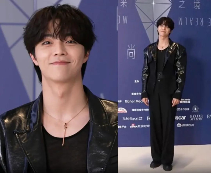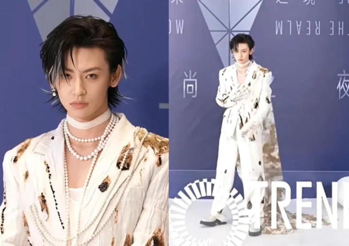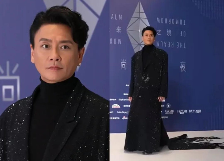 黄宗泽虽然穿的是黑色礼服,但他的外套是带有亮片和长拖尾的款式,仿佛穿了一条西装长裙,低调却不沉闷。当然了,好不好看另说。