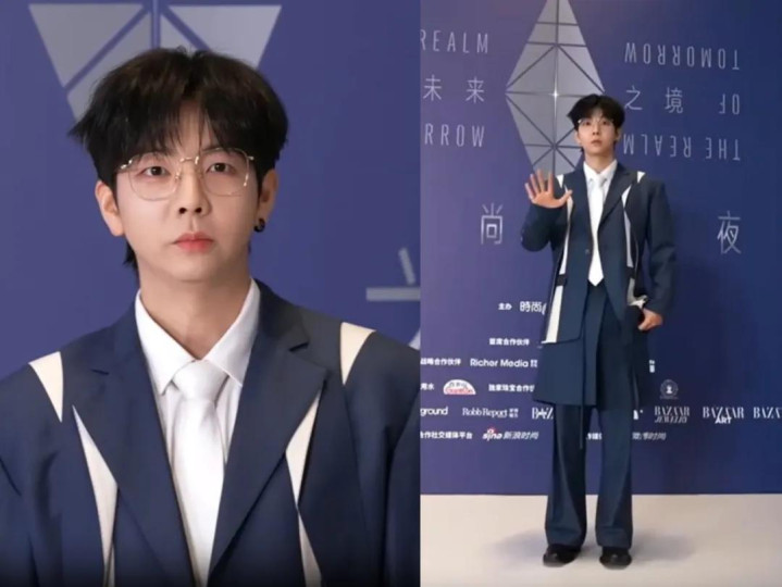 胡夏穿了一套蓝白色西装,从正面看还以为他背着一个白色的书包。再加上他戴了一副眼镜,看着还挺有校园感(指服装)。