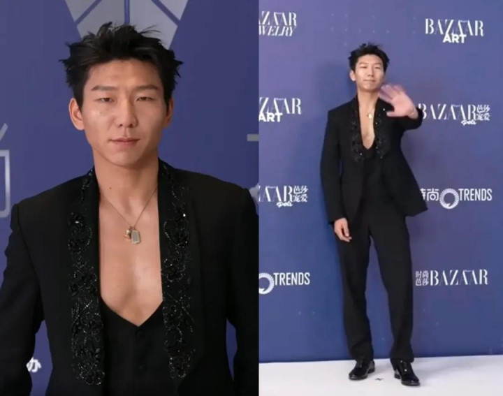 阿如那穿了一套黑色深V西装,跟他带有痞气的硬汉气质很搭。