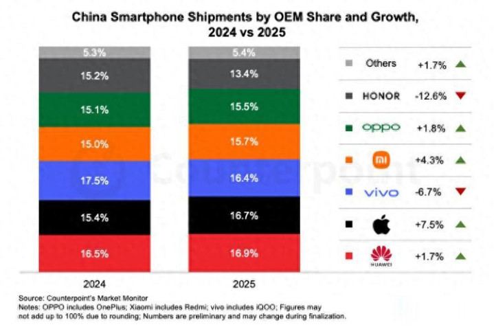 开云app登录 2025年中国手机市场报告出炉: 华为市占率16.9%, 位列第一