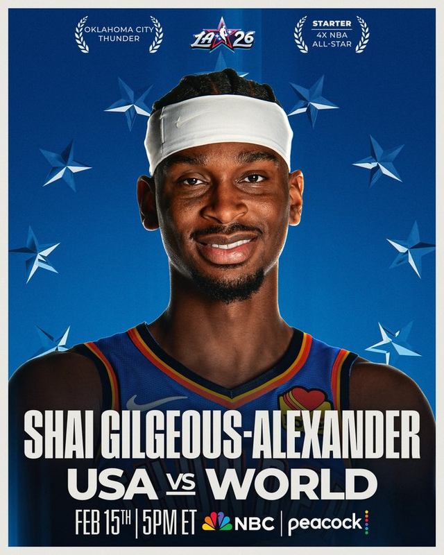 亚历山大成为西部全明星首发,这是他生涯第4次入选全明星,也是连续第4年入选。赛季至今,亚历山大场均31.8分4.4篮板6.2助攻。