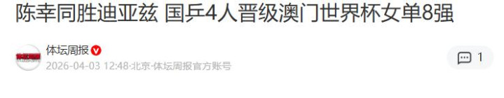 体坛周报:陈幸同胜迪亚兹 国乒4东说念主晋级澳门寰球杯女单8强