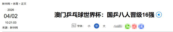 新华网:澳门乒乓球寰球杯:国乒八东说念主晋级16强