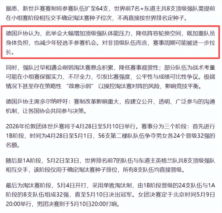 为适配扩军后的赛事框架,国外乒联推出全新赛制,其中针对顶尖军队的晋级与竞赛安排,成为德国乒协质疑的中枢。