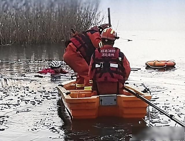 当天15时48分,沧州市消防救援支队任丘北站西路站消防员接到消息:在任丘市太平庄村东水塘,有人落入冰窟。消防员立即携带救援装备赶到现场。