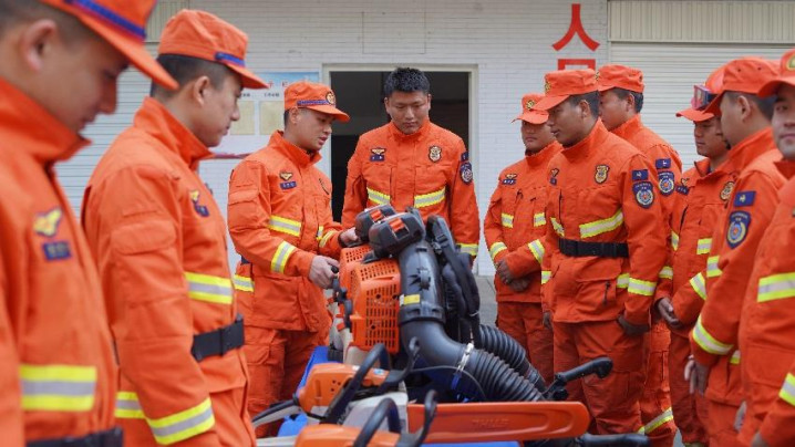 消防救援人员为攀枝花米易县地方专业扑火队员讲解森林灭火装备。王古清摄