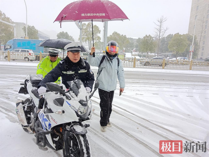 大雪下了一夜。1月20日上午,风雪天气仍在继续,潜江市民杨先生驾驶摩托车时不慎滑倒,市公安局交管大队城区中队民警杨道华及同事火速上前,将人扶起并帮忙推车,而杨先生全程为执勤民警撑伞致谢,这一幕在风雪中定格成冬日里动人的风景。
