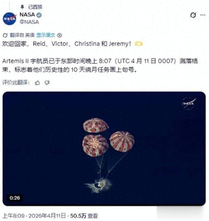2026年4月14日,阿耳忒弥斯二号飞船冲进大气层,速率达到四万公里每小时,高温烧到近三千度,通信断了七八分钟,这即是黑障区,舱里四名宇航员早就知谈,防热罩在两年前一号任务时就发现上百处裂纹,到当今没换新材料,只靠计算更精准少量、角度改造更玄妙少量,硬着头皮往下冲,这不是时刻跨越,是拿生命赌概率。