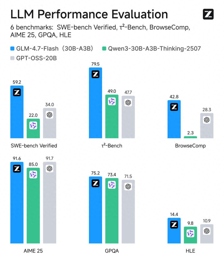 GLM-4.7-Flash 是一个混合思考模型,总参数量为 30B,激活参数量为 3B,宣称作为同级别 SOTA 模型,为轻量化部署提供了一个兼顾性能与效率的新选择。