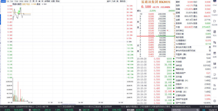上证报中国证券网讯(记者周亮)1月20日,易通讯集团复牌后大涨,股价盘中最高涨超70%。截至10时24分,易通讯集团股价为0.5港元/股,涨幅为53.85%。