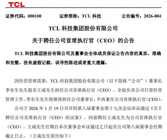 2026 年 1 月 19 日,TCL 科技集团股份有限公司(证券代码:000100,证券简称:TCL 科技)发布编号为 2026-004 的公告,宣布公司第八届董事会第十九次会议审议通过《关于聘任公司首席执行官 (CEO) 的议案》。根据经营管理需要,经公司董事长李东生先生提名,董事会同意聘任王成先生为公司首席执行官(CEO),全面负责公司日常经营管理工作。李东生先生将继续担任公司董事长,不再兼任首席执行官一职。