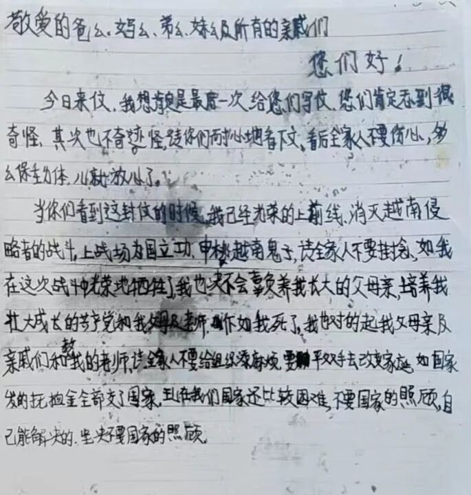 阆中籍义士蒙林殉国前,给父母的临了一封家信写说念:“假如我死了,……请全家东说念主不要给组织添空泛,要凭双手去改动家庭,如国度发的抚恤金,全部交给国度,当今我们国度还比拟艰巨,不要国度的护理,我方能握住的,坚韧不要国度的护理。”