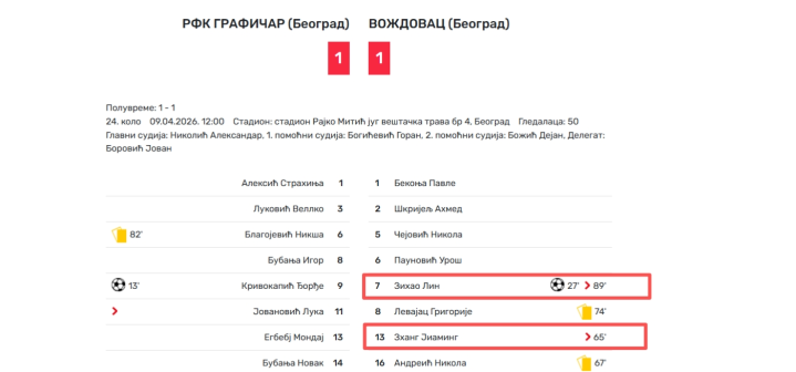 2026年4月10日,塞尔维亚U19联赛第24轮,沃日多瓦茨U19客场1-1战平格拉菲卡U19,中国球员林子皓与张家鸣再次一皆头发。在这场比赛中,他们两东说念主不仅赢得了首发出场的契机,其中林子皓还获利了进球。林子皓发达出色,他打进了本场比赛沃日多瓦茨队的惟一进球,同期匡助球队战平敌手。赛后林子皓被评为全场MVP。